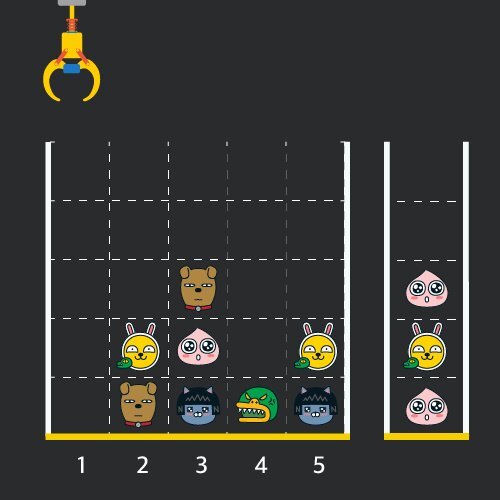 크레인 작동 시 인형이 집어지지 않는 경우는 없으나 만약 인형이 없는 곳에서 크레인을 작동시키는 경우에는 아무런 일도 일어나지 않습니다. 또한 바구니는 모든 인형이 들어갈 수 있을 만큼 충분히 크다고 가정합니다. (그림에서는 화면표시 제약으로 5칸만으로 표현하였음)