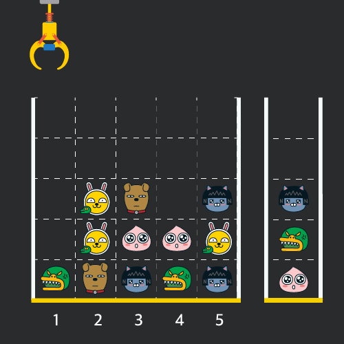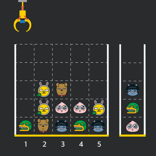 게임 화면은 "1 x 1" 크기의 칸들로 이루어진 "N x N" 크기의 정사각 격자이며 위쪽에는 크레인이 있고 오른쪽에는 바구니가 있습니다. (위 그림은 "5 x 5" 크기의 예시입니다). 각 격자 칸에는 다양한 인형이 들어 있으며 인형이 없는 칸은 빈칸입니다. 모든 인형은 "1 x 1" 크기의 격자 한 칸을 차지하며 격자의 가장 아래 칸부터 차곡차곡 쌓여 있습니다. 게임 사용자는 크레인을 좌우로 움직여서 멈춘 위치에서 가장 위에 있는 인형을 집어 올릴 수 있습니다. 집어 올린 인형은 바구니에 쌓이게 되는 데, 이때 바구니의 가장 아래 칸부터 인형이 순서대로 쌓이게 됩니다. 다음 그림은 [1번, 5번, 3번] 위치에서 순서대로 인형을 집어 올려 바구니에 담은 모습입니다.